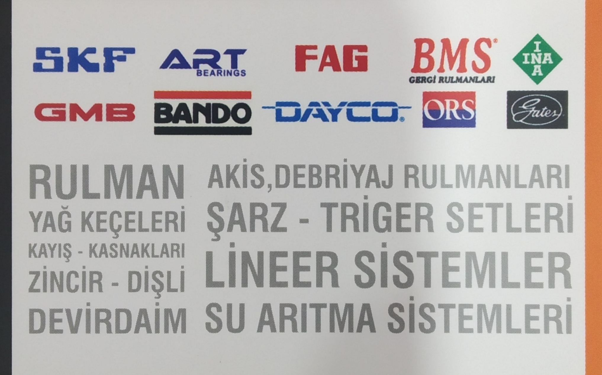 Bayisi olduğunuz markalar : skf, fag , ına, luk, tımken, snr, ntn, nsk, koyo, ors, nachı, skt, supteks , corteco, simrit, aba, gmw, bms, gmb, gates, dayco, bando, continental, derby, ....
